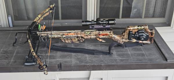 Wicked Ridge Invader HP Crossbow with Acudraw. Includes five arrows three of which have new Broadhead on them. , sling, and one used Wicked Ridge Crossbow case. Will also include Morrell discharge...